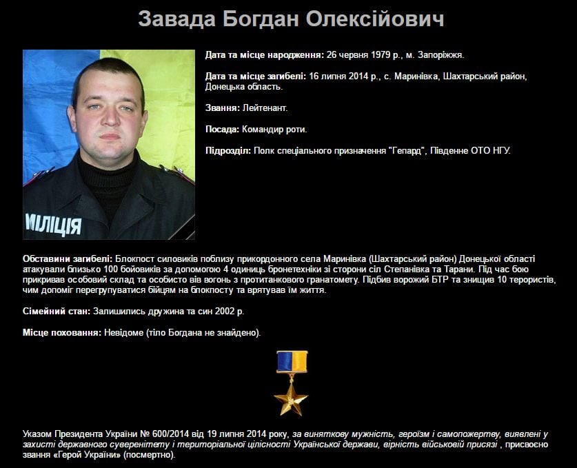 Из противотанкового гранатомета лейтенант Завада подбил БТР и уничтожил 10 человек, тем самым он спас жизнь сослуживцев. О судьбе отважного офицера с тех пор ничего не известно, его тело не найдено.