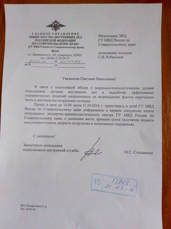 "Прошу в срок до 14:00 01.04.2016 г. предоставить в штаб ГУ МВД по Ставропольскому краю информацию о первом сексуальном опыте сотрудников экспертно-криминалистического центра ГУ МВД России по Ставропольскому краю с указанием места, времени суток получения первого сексуального опыта, возраста сотрудника и испытанных ощущениях”, - говорится в документе.