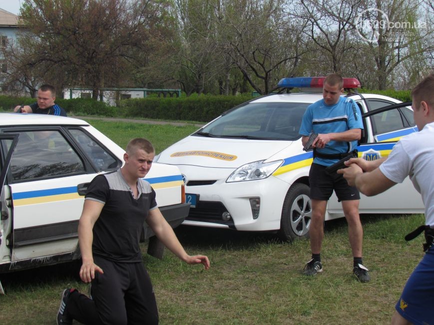 Были продемонстрированы особенности блокировки автомобиля с условными нарушителями и тактика зачистки помещений. Полицейских тренируют с резиновыми макетами пистолетов.