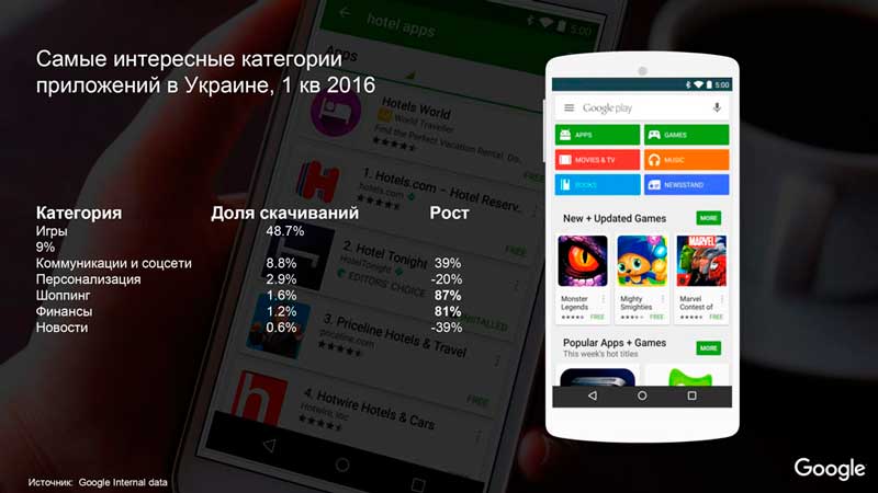 В нашей стране статистика по использованию мобильных приложений позитивная. Только за первый квартал текущего года рост скачивания приложений составил 16%, а доходы разработчиков выросли на 40%. На первом месте пока традиционно идут игры, но им в спину дышат финансовые и шопинговые приложения.
