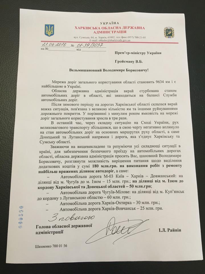 Глава Харьковской ОГА Игорь Райнин направил письмо главе Кабмина, в котором сообщил о плачевном состоянии дорог общего пользования в Харьковской области. Об этом сообщает портал Главное.