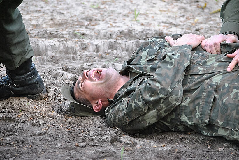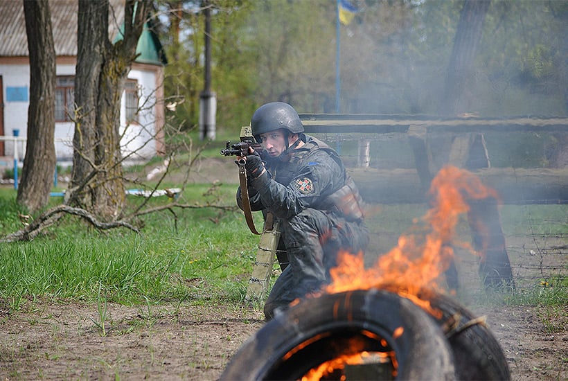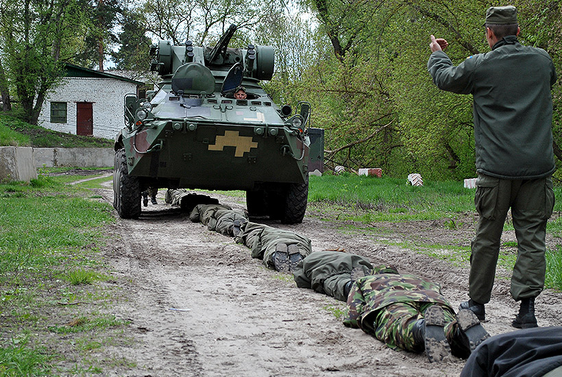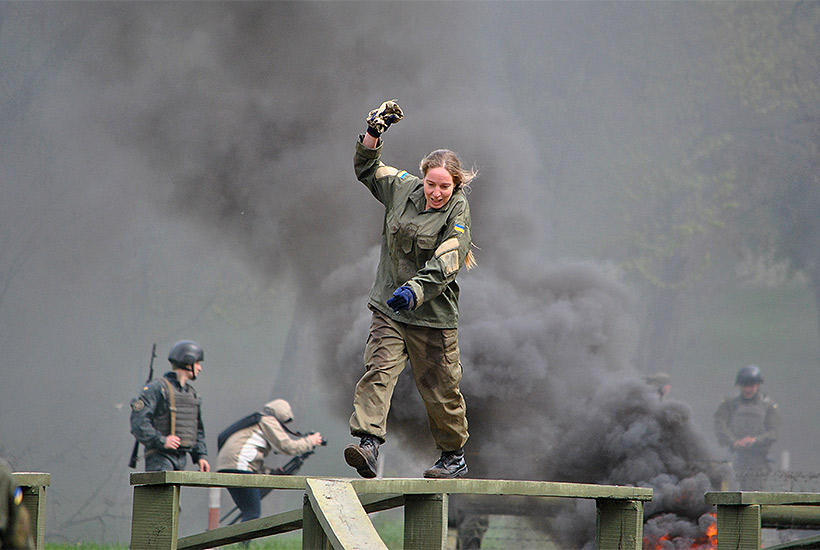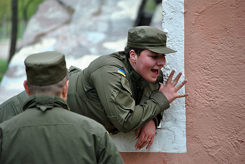 На базе учебного центра Национальной академии Национальной гвардии Украины военные психологи через огонь, выстрелы, взрывы и детский плач проходили психологическую полосу препятствий.