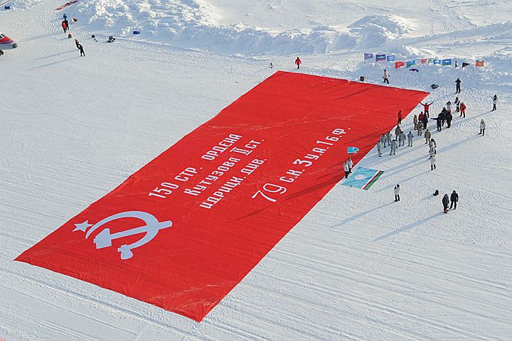 Полотнище размером 25 на 40 метров было доставлено туда сотрудниками МЧС и Российского географического общества, передает "КП".