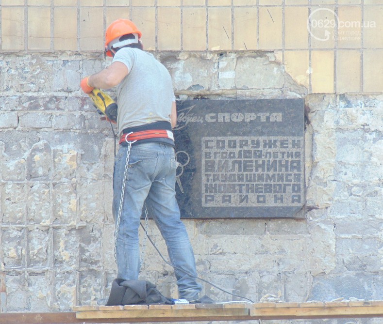 Ремонтники декоммунизировали здание спорткомплекса в рамках проводимых работ по замене облицовки стен.