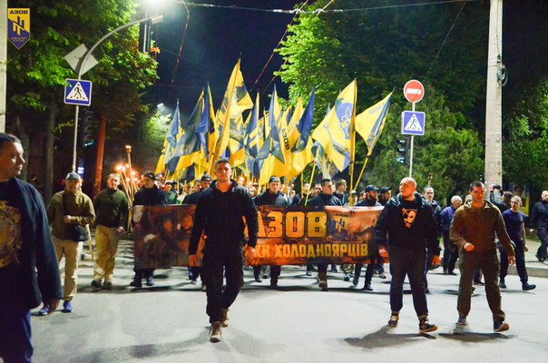 Шествие стартовало в Долине роз, где в течение дня продолжалось патриотическое праздник и концерт. С флагами и факелами активисты "Азова", "Сокола", представители добровольческих батальонов, рядовые горожане и родственники погибших на Донбассе черкащан прошли до площади Богдана Хмельницкого.