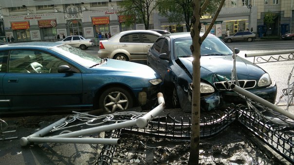 Сегодня утром в Харькове практически перед мэрией произошло ДТП, участники которого разрушили ограждение проезжей части.