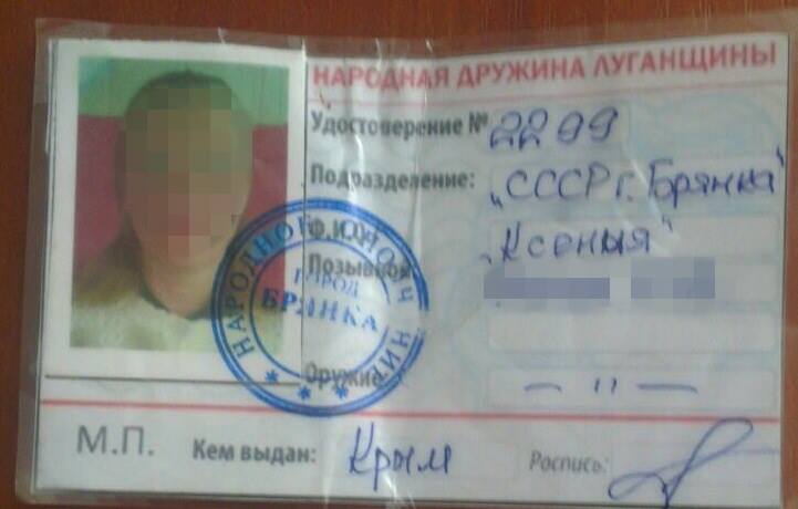 Во время осмотра правоохранители изъяли у злоумышленницы удостоверение "народной дружины Луганщины" и личный металлический жетон "ВС Новороссии".