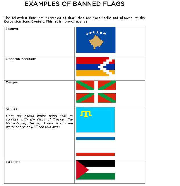 Особенно организаторы отметили, что запрещенные флаги Косово, Нагорного Карабаха, Страны Басков, Автономной Республики Крым и крымских татар, Палестины, Северного Кипра, Приднестровья, а также "ДНР" и "ИГИЛ".