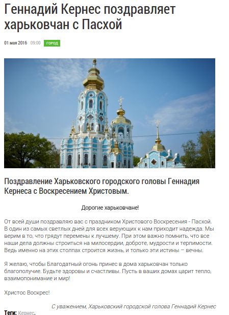 Харьковский городской голова Геннадий Кернес поздравил жителей города с Пасхой. Соответствующее поздравление опубликовала пресс-служба мэра.