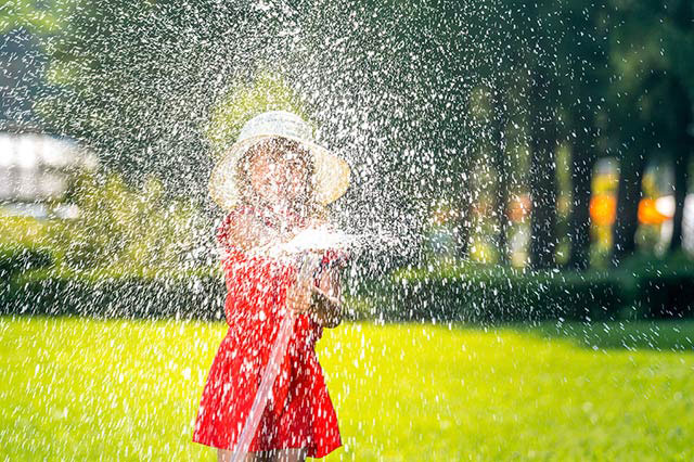 Периодичность полива зависит от погоды. Поливать газон необходимо в засушливый период, чтобы не дать траве погибнуть под устойчивым зноем. Лучше, если это будет капельный полив. Большой напор из водяного шланга вреден, так как может образовать проплешины. Можно приобрести специальные наконечники для шланга, которые помогут деликатно и качественно оросить газон, либо целую поливочную установку. Для полива берется большое количество воды, ведь необходимо увлажнить почву на 15 см, на 1 кв.м достаточно 30 л или чуть меньше. Еще одно правило. Нельзя поливать в солнечный день, под палящими лучами солнца. Трава может получить сильный ожог от направленного света и тепловой от быстрого испарения влаги.