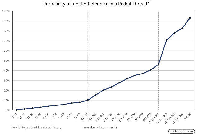 CuriousGnu.com использовал доступные данные о дискуссиях на платформе Reddit. Проанализировав 4,6 миллиона комментариев, автор блога пришел к выводу, что в тредах длиной в 1000 комментариев вероятность упоминания Гитлера и нацизма составляет более 70 процентов. В случае, если в дискуссии насчитывается больше 4000 комментариев, вероятность упоминания Гитлера превышает 90 процентов.3