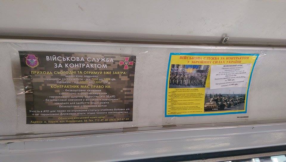 При этом городские чиновники откровенно лукавят, потому что уже довольно давно в харьковском транспорте можно встретить аналогичную рекламу контрактной службы ВСУ, где также изображены люди с оружием и даже танковая колонна.