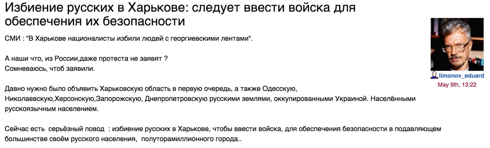 Бывший писатель, бывший лидер российских "нацболов", бывший харьковчанин Эдуард Лимонов призывает ввести в Харьков российские войска…