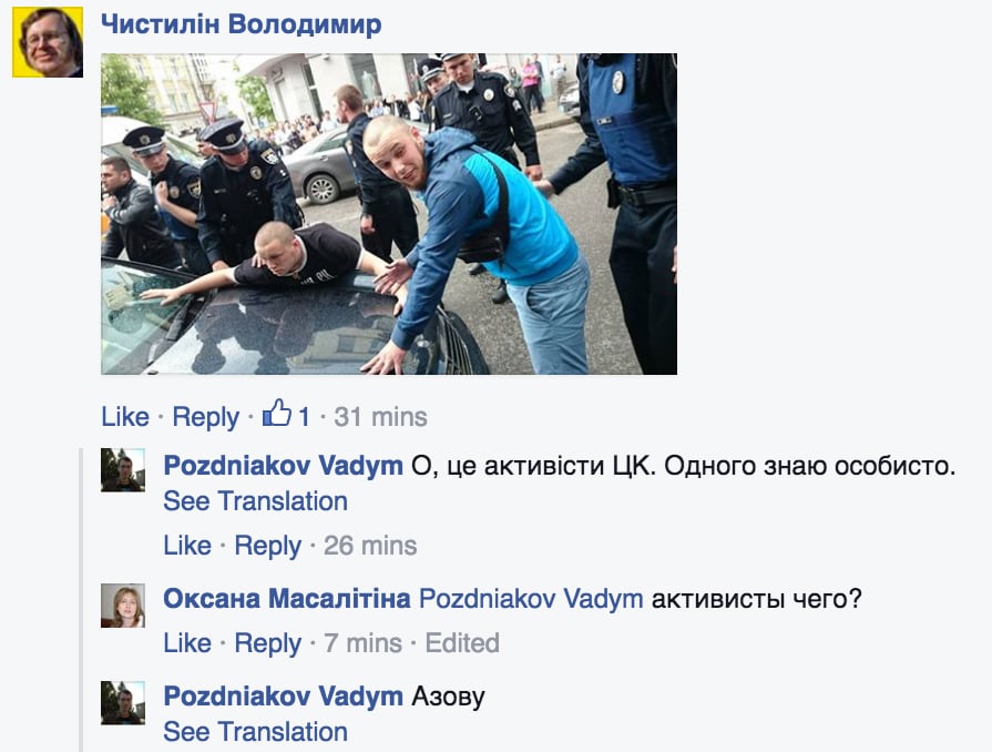 На данный момент задержаны четыре участника конфликта, в том числе и водитель. И.Назаренко отказался подтвердить или опровергнуть информацию о том, что эти люди имеют отношение к "Гражданскому корпусу Азов".