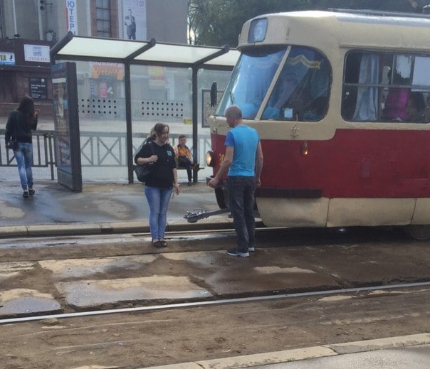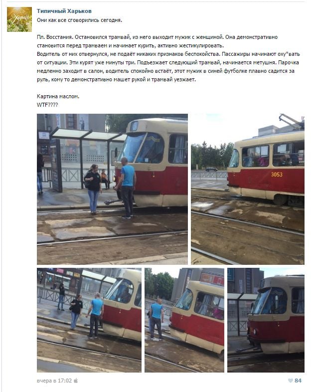 Водитель от них отвернулся, не подаёт никаких признаков беспокойства. Пассажиры начинают ох**вать от ситуации. Эти курят уже минуты три. Подъезжает следующий трамвай, начинается метушня. Парочка медленно заходит в салон, водитель спокойно встаёт, этот мужик в синей футболке плавно садится за руль, кому то демонстративно машет рукой и трамвай уезжает.