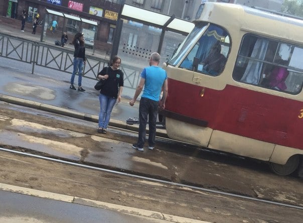 Пл. Восстания. Остановился трамвай, из него выходит мужик c женщиной. Она демонстративно становится перед трамваем и начинает курить, активно жестикулировать.