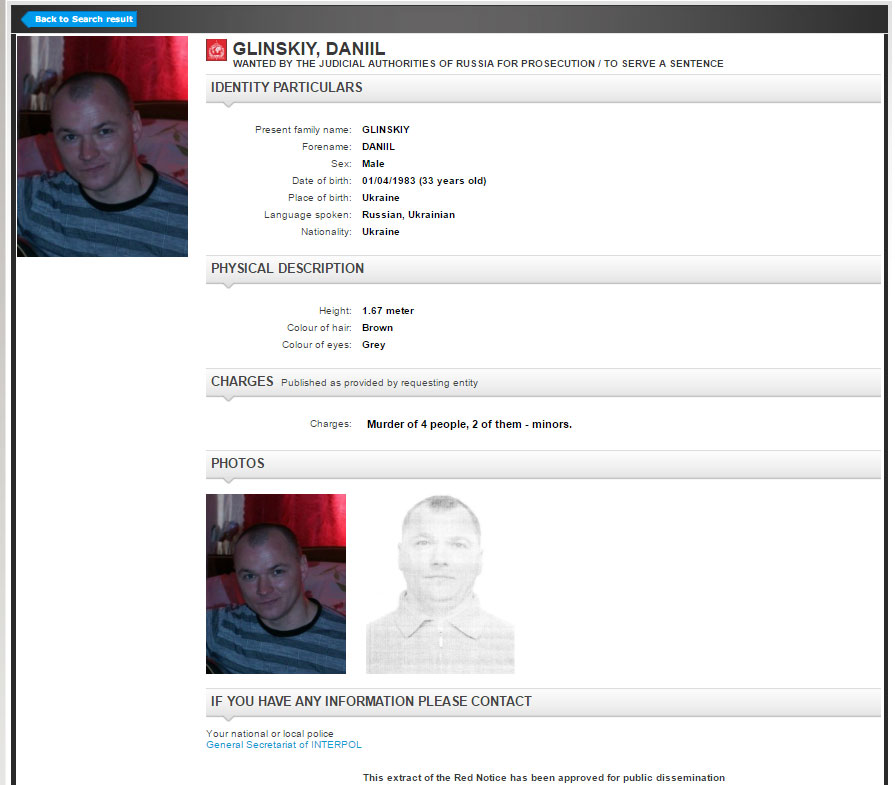 В так называемом разделе «красный угол» на интернет-портале ведомства говорится о том, что 33-летний уроженец Украины Даниил Глинский разыскивается за убийство четырех человек, в том числе двоих детей. В ориентировке приводятся его приметы: серые глаза, рост 167 сантиметров, каштановые волосы. Лиц, располагающих сведениями о месте нахождения Глинского, просят обращаться в Генеральный секретариат Интерпола.