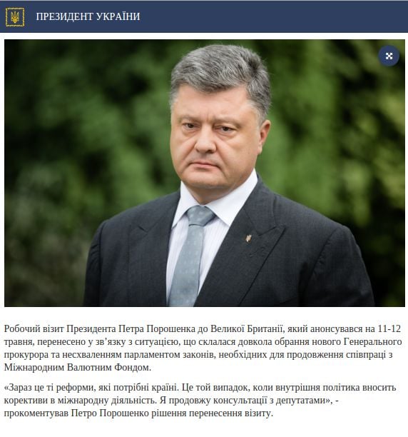 Президент Украины Петр Порошенко перенес рабочий визит в Великобританию в связи с ситуацией, сложившейся вокруг избрания нового генерального прокурора и неодобрением парламентом законов, необходимых для продолжения сотрудничества с Международным валютным фондом.