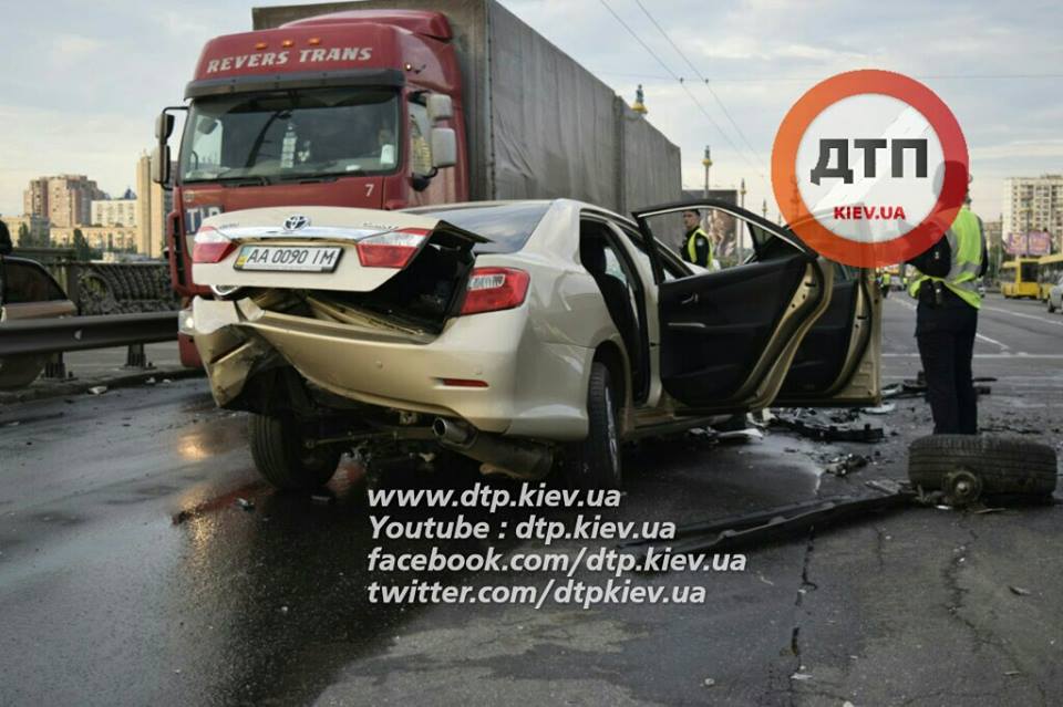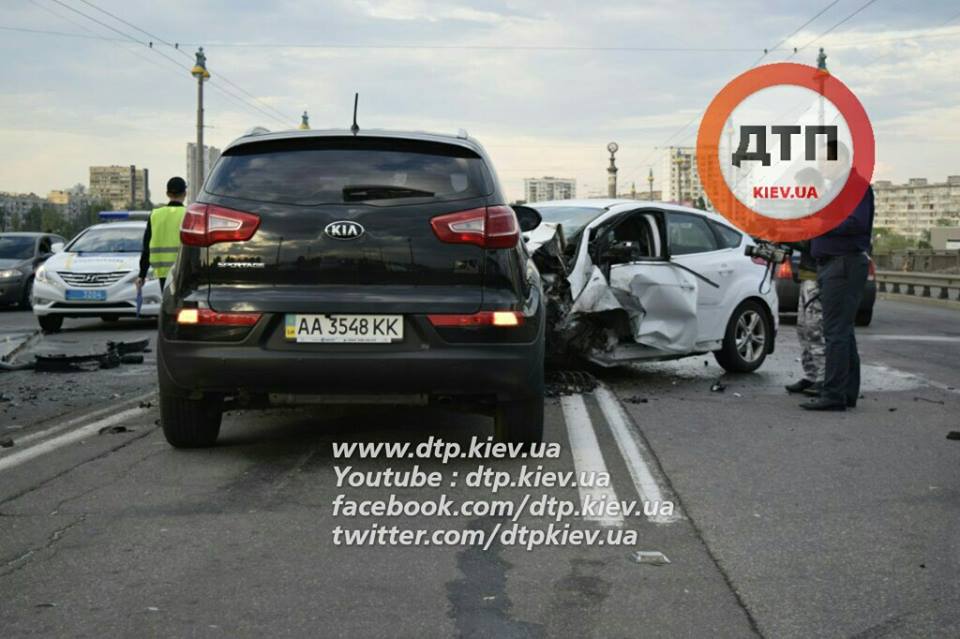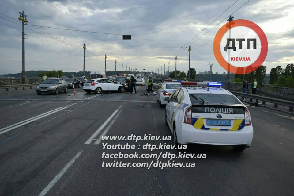 В сети появились фотографии и видео с места автомобильной аварии в Киеве на мосту Патона, где в ДТП попали четыре автомобиля.