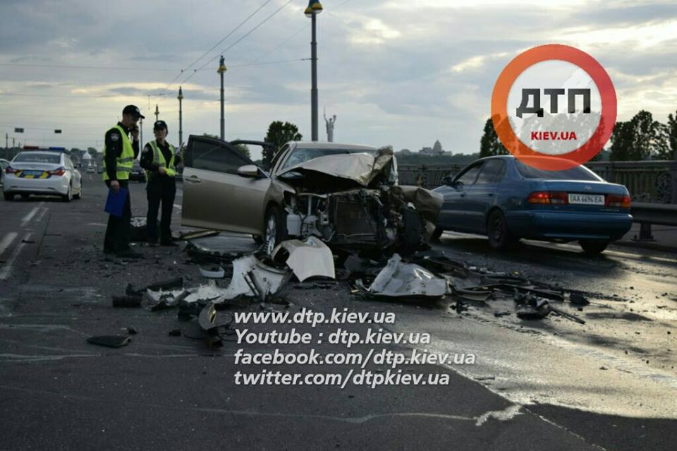 "Как рассказали очевидцы происшествия, водитель Ford Focus, двигаясь в направлении левого берега, выехал на полосу встречного движения, где лоб в лоб столкнулся с двигавшейся навстречу Toyota Camry. От мощного лобового удара Toyota отлетела в двигавшийся правее Ford Escort. В отлетевший же Ford Focus врезался Kia. Escort загорелся, к нему бросились остановившиеся водители с огнетушителями. Другие очевидцы бросились к зажатому в Toyota водителю. С помощью специнструмента спасатели Государственной службы по чрезвычайным ситуациям достали мужчину, сидевшего за рулем Toyota, и передали его медикам. Также был госпитализирован водитель Focus. Водитель Escort получил травму руки, но от госпитализации отказался. В Kia на заднем пассажирском сидении находился десятилетний ребенок, но, к счастью, травм он не получил", — сообщает издание.
