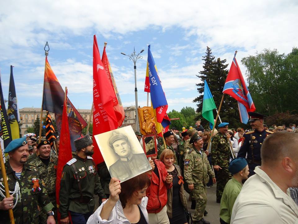 В Алчевске, подконтрольном «ЛНР», в рамках мероприятий, посвященных празднованию Дня Победы по площади Ленина прошла колонна, участники которой несли портреты с погибшими участниками ВОВ.