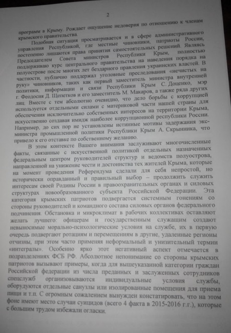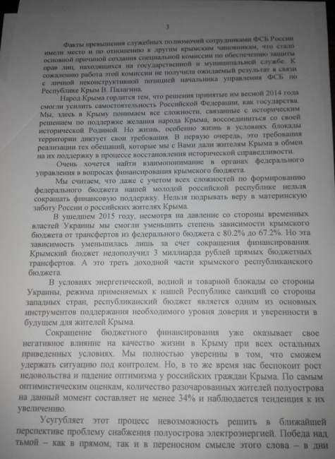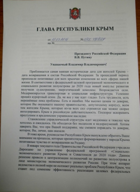 "Практическое проявление заботы в отношении населения российского Крыма поможет нам преодолеть растущее уныние, неуверенность и страх, которые распространяются среди российских граждан республики Крым. Это влияние усиливает у жителей Крыма сравнительное мышление между украинским прошлым и российским настоящим, что может повлечь за собой негативное развитие событий", - пишет самопровозглашенный глава Крыма.