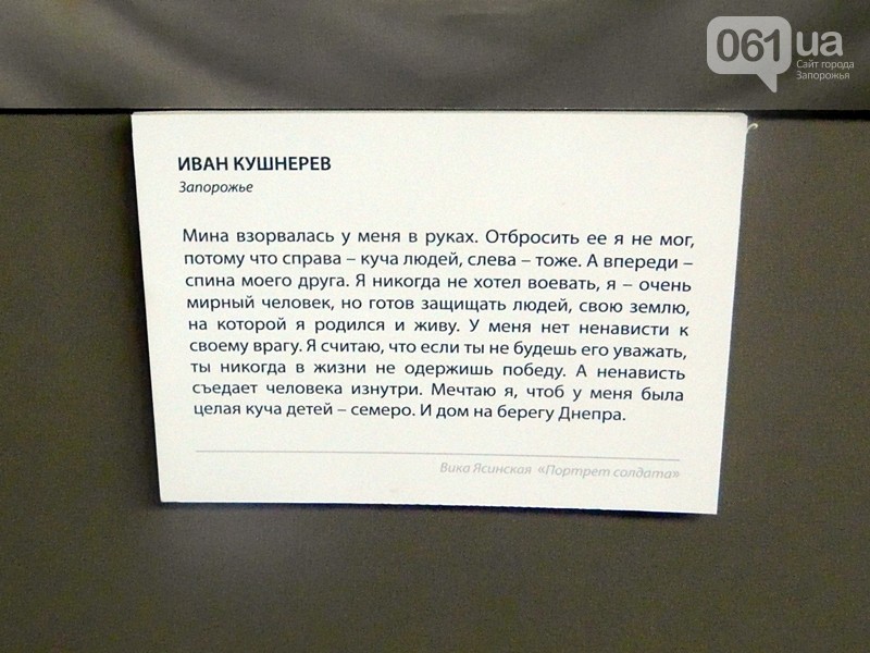 Среди бойцов, чьи портреты и цитаты можно увидеть на выставке, есть и три запорожца - Вячеслав Зайцев, Иван Кушнерев и Александр Федорченко.