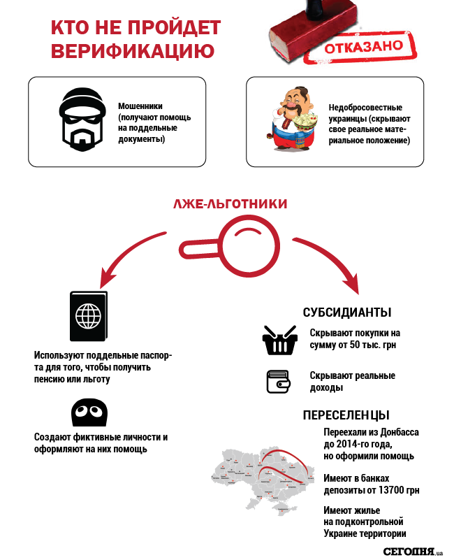Верификацию не прошли около 100 тысяч семей переселенцев. Каждая семья в среднем получала 1314 гривен ежемесячно. Для того, чтобы оставить жителей оккупированной территории Донбасса без помощи, необходимо, чтобы переселенцы соответствовали хотя бы одному из условий: