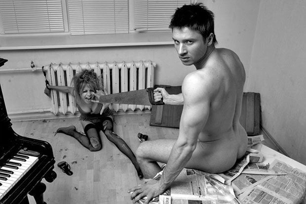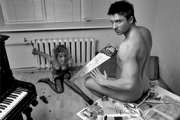 На фото мужчина, похожий на Сергея Лазарева, изображен в постановочной сцене с женщиной, прикованной к батарее отопления. Российский исполнитель, которому многие пророчат победу на Евровидении, держит в руках ножовку.