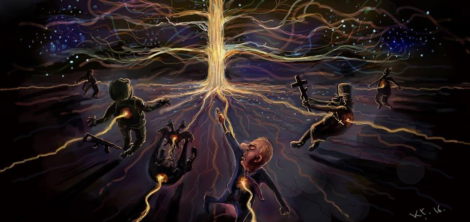 Ключник нарисовал, как корни этого дерева пронзают насквозь представителей "русского мира": человека, похожего на президента РФ Владимира Путина, священника с крестом, "вежливого человечка" с автоматом в руках и символ имперской России – двуглавого орла.