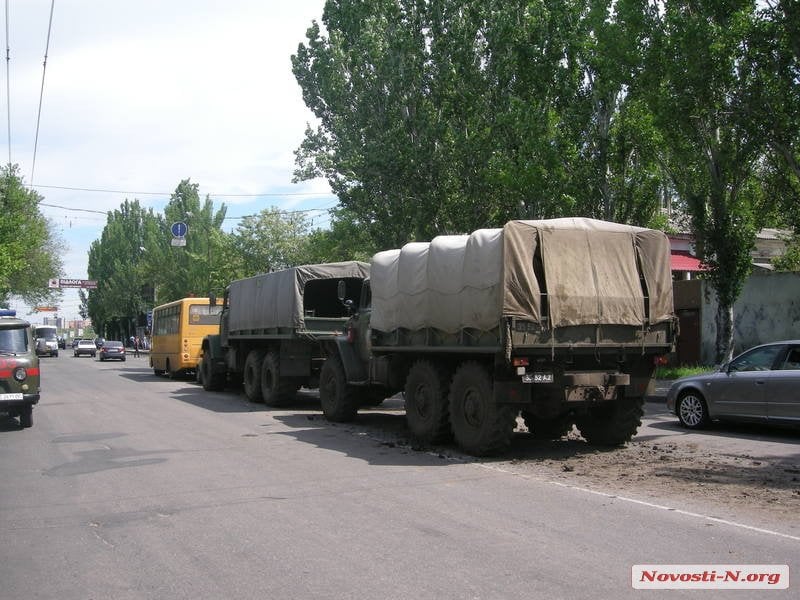 Два армейский грузовика — КрАЗ и «Урал» ехали по ул. Пушкинской со стороны ул. Никольской в направлении Ингульского моста. Перед светофором водитель «Урала» врезался сзади в КРАЗ, который, в свою очередь, въехал в двигавшуюся впереди «Дэу Нексия».