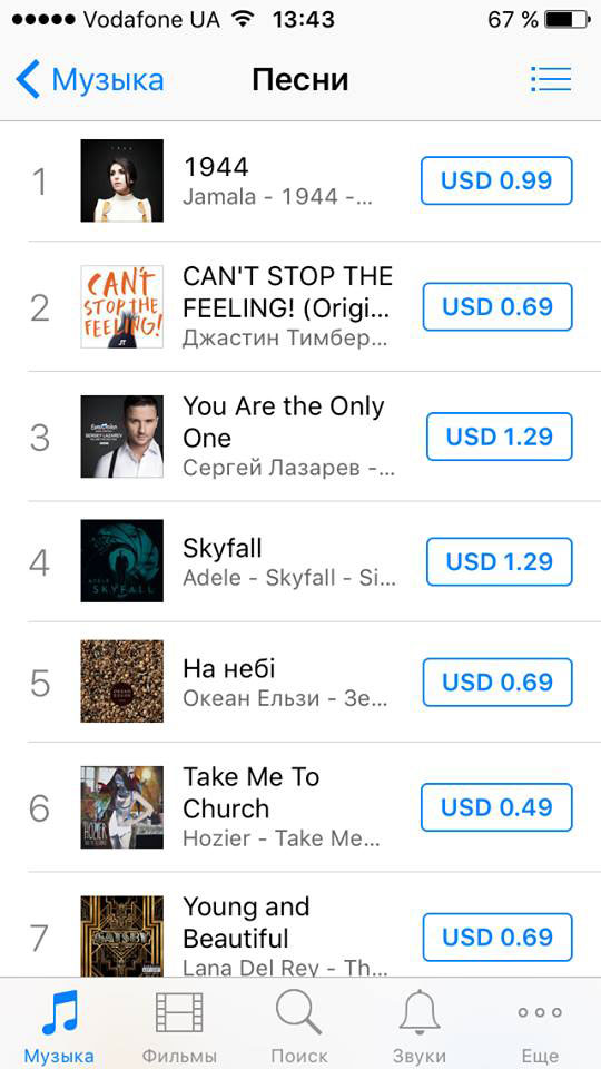 Песня Джамалы под названием "1944", которую она исполнила на «Евровидении», стартовала с первой строчки в чартах iTunes. На втором месте "Can't stop the feeling" Джастина Тимберлейка, который выступил на международном конкурсе в качестве приглашенной звезды.