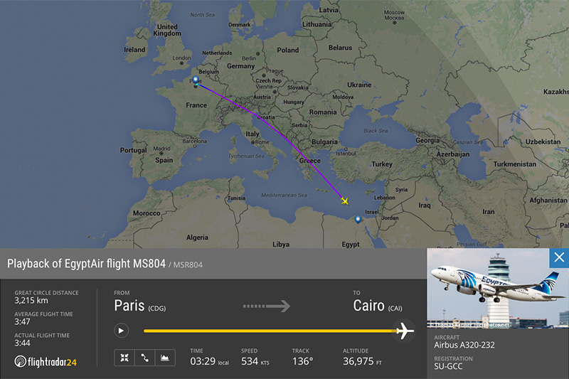 Запись полета на сервисе Flightradar обрывается над Средиземным морем на подлете к Египту, при этом в таблице самолет отмечен как приземлившийся в Каире в 4:06 по местному времени (5:06 мск). Перед исчезновением самолета сервис не зафиксировал изменение высоты полета самолета: судно находилось на высоте 11270 м. По данным Flightradar, самолет был выпущен в 2003 году.