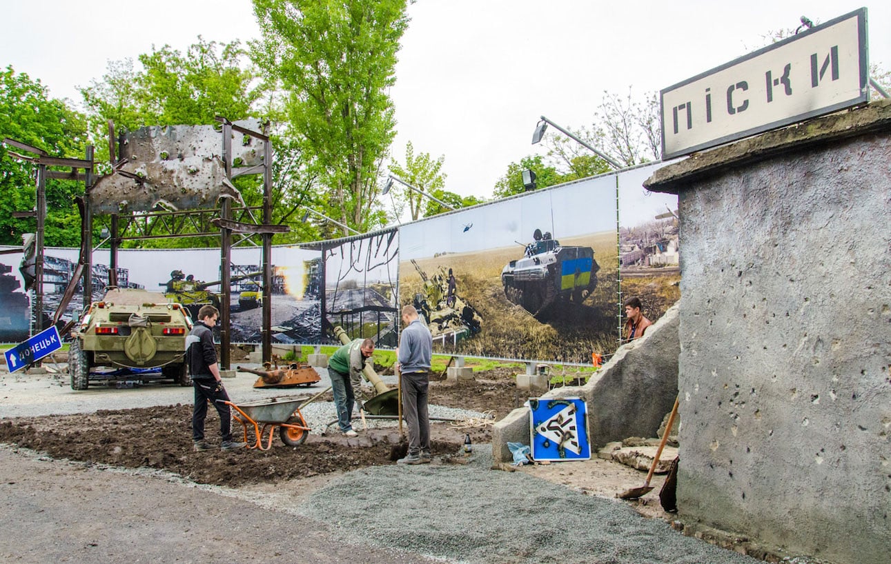 Уличная экспозиция включает разбитый минами асфальт, блокпост на обочине дороги, а также простреленные указатели с названиями населенных пунктов Донбасса.