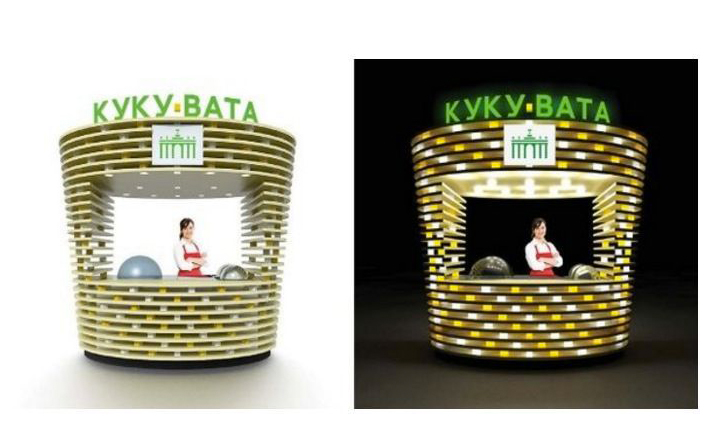 Шрифтовая композиция названия торгового объекта - «Куку-вата» или «Вода-мороженое» - будет смонтирована на крыше павильона. Павильон «Куку-вата» будет оснащен пароварками для кукурузы, аппаратом для приготовления сахарной ваты и холодильником. Павильон «Вода-мороженое» будет оснащен холодильным оборудованием для воды и безалкогольных напитков и морозильником для мороженого.