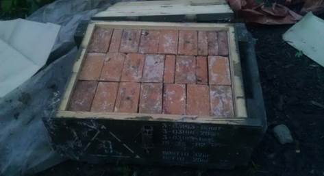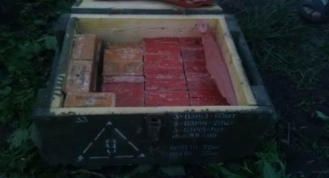 Отмечается, что из замаскированного тайника правоохранители изъяли два ящика с тротиловыми шашками армейского образца общим весом примерно 45 кг.