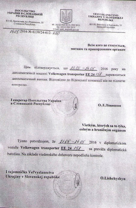 "Настоящим подтверждается, что 21.05 – 24.05 2016 года на дипломатической машине Volkswagen Transporter EE 24 158 перевозится дипломатический груз. Согласно Венской конвенции он не подлежит контролю", – говорится в письме.