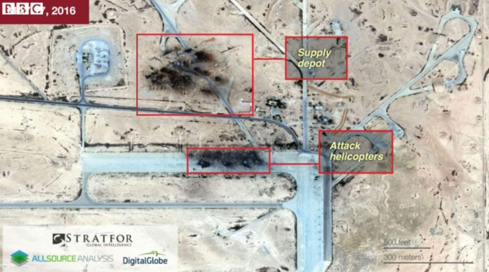 Сравнивая фотографии с более ранними съемками базы Тияс, эксперты Stratfor полагают, что на взлетной полосе видны остовы вертолетов Ми-24, а здание раньше было складом, с которого они снабжались.