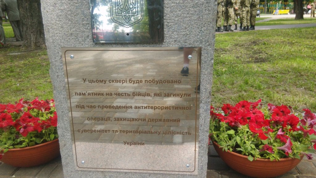 "В этом сквере будет построен памятник в честь бойцов, которые погибли во время проведения антитеррористической операции, защищая государственный суверенитет и территориальную целостность Украины", - гласит памятная табличка.