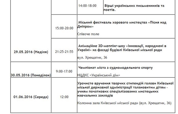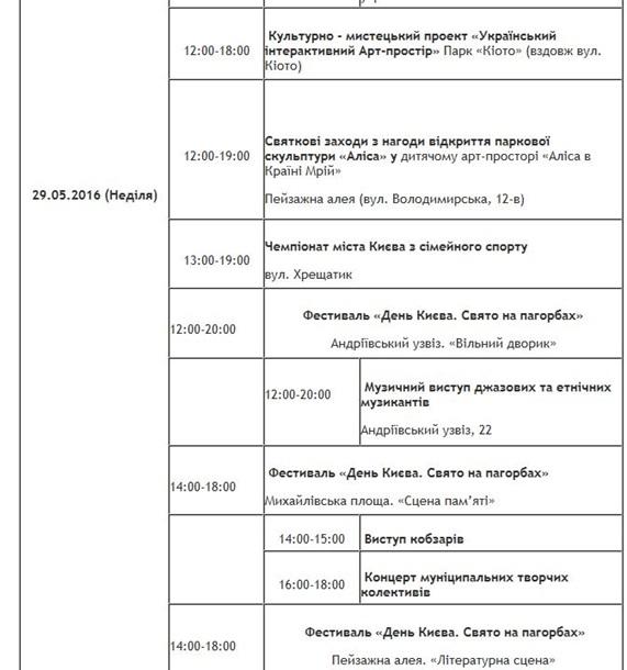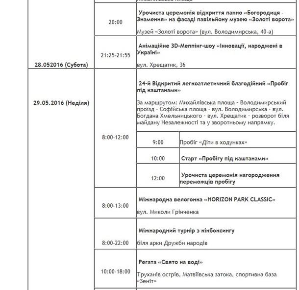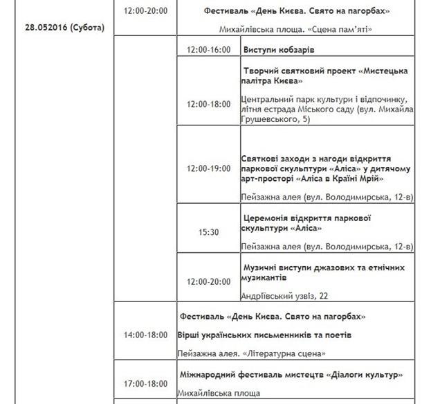 Киев празднует день города: расписание мероприятий 28 мая 2016 12:48 Сегодня, 28 мая, столица Украины празднует День города. "Главное" публикует список праздничных мероприятий, которые пройдут сегодня и завтра в разных уголках Киева.