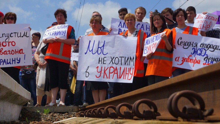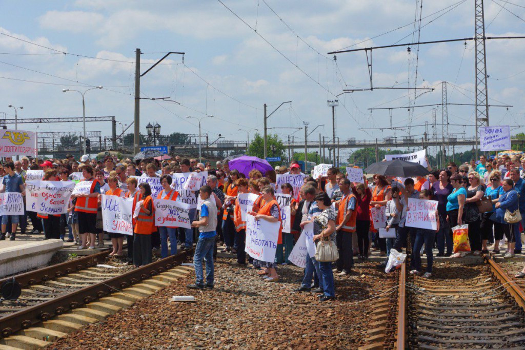 В руках протестующие держали плакаты «Мы не хотим в Украину», «Украина, верни зарплату», «Украина — заплати», «Мы не выпустим не одного вагона в Украину».