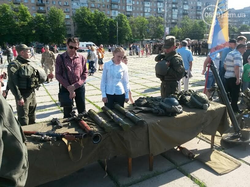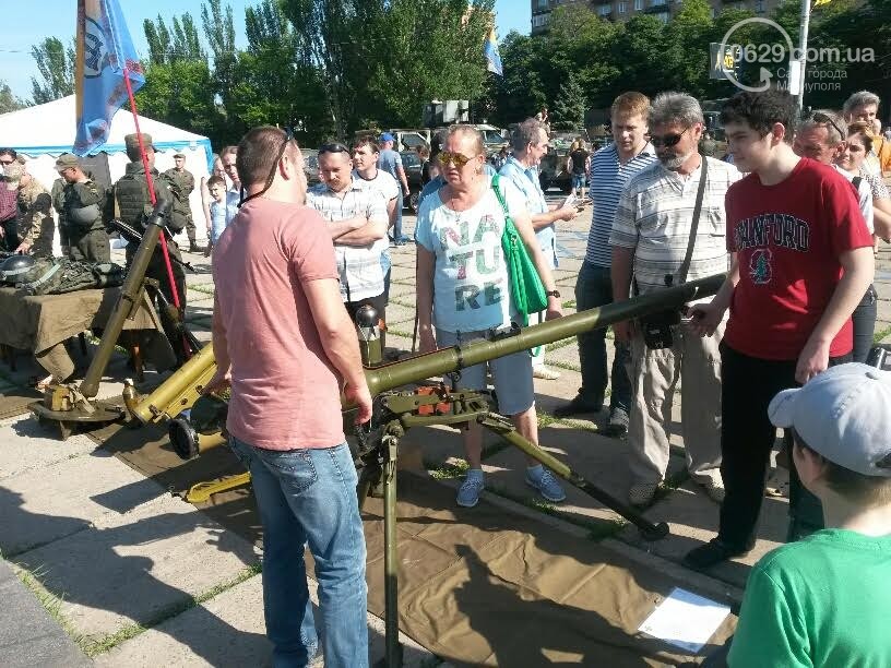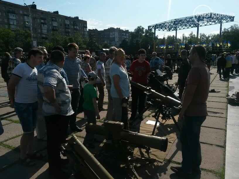 Сейчас на площади проходит концерт, который продлится ориентировочно до 19.30. Здесь же работает выставка военной техники. Жители могут увидеть броневики на базе КРАЗов, БТР, тачанки (джипы, переделанные под военные автомобили). Каждый автомобиль оборудован каким-нибудь оружием. Также жители, большинство из которых мужчины, заинтересовались оружием - зенитными установками, 82-мм минометами, АГС-17, ПТУРом, СПГ-9, фаготом.