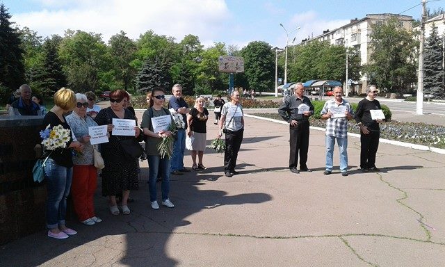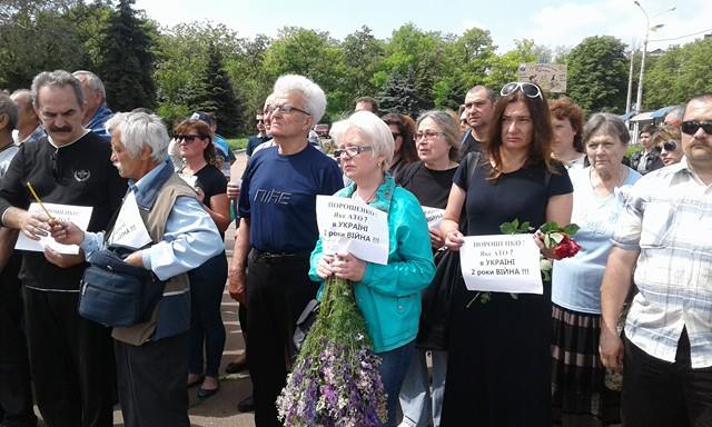 У пришедших проститься с погибшими в руках небольшие плакаты с надписью: «Порошенко, яке АТО? В Україні два роки війна!»