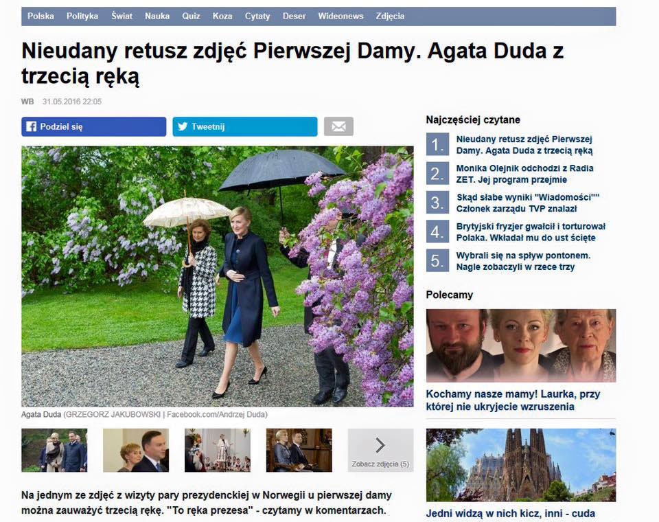 Снимок был опубликован на официальной странице президента Польши в Facebook после визита в Норвегию, в котором главу государства сопровождала его супруга. На фотографии первая леди прогуливается по парку, ее сопровождают мужчина и женщина. Одной рукой Агата Дуда придерживает пальто, вторая опущена вниз, а из-за спины виднеется третья. Местные интернет-пользователи, а вслед за ними и издание gazeta.pl предположили, что странная физиология Дуды стала последствием неудачной ретуши.