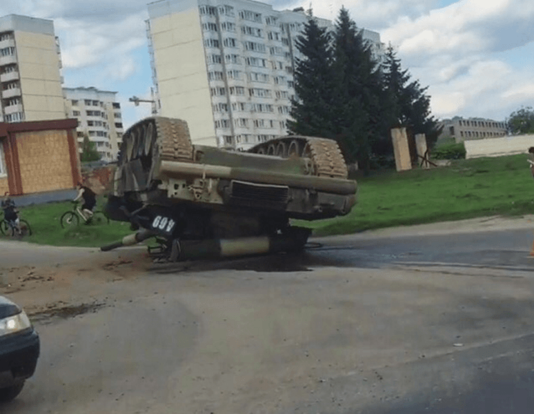 В четверг в российском городе Наро-Фоминск перевернулся танк, который двигался в колонне военной техники.