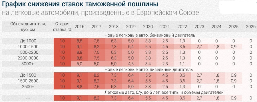 Согласитесь, разница более чем ощутима. Не следует забывать и о других основных компонентах «растаможки», которые остаются в силе. Таможенная пошлина для большинства автомобилей равна 10% от оценочной стоимости транспортного средства. Если вы сможете предоставить документы о том, что автомобиль имеет происхождение из Евросоюза – то пошлина для него будет чуть меньше, – в этом году 9,1%. Далее, с каждым годом, пошлина на авто из ЕС будет уменьшаться, пока не станет нулевой. Поэтому в расчет мы берем машины только из ЕС. Тем более, что действие сниженных ставок акцизного сбора не будет распространяться на машины из стран-оккупантов или агрессоров.