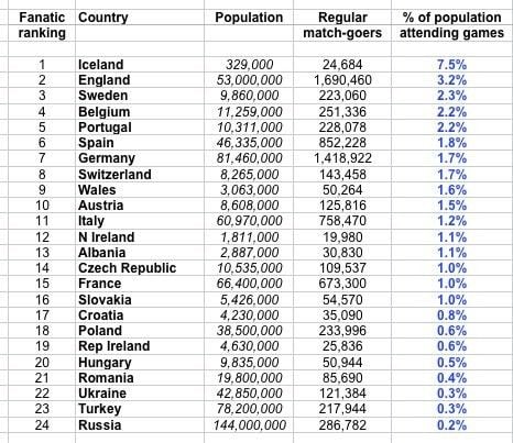 Английское издание Daily Mail провело исследование популярности футбола в странах-участницах Евро-2016. За основу расчетов бралось соотношение общего количества населения страны и посещаемости стадионов.