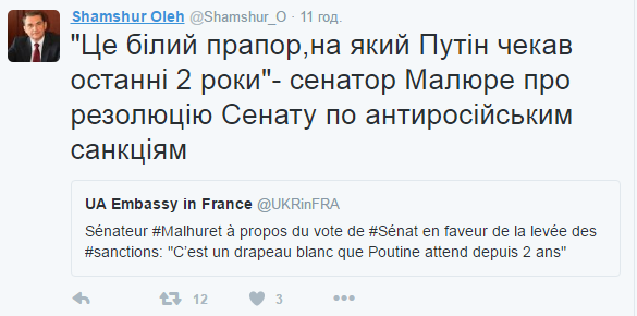 Такое мнение высказал сенатор Клод Малюре, передает Эспрессо.TV. со ссылкой на посольство Украины во Франции.