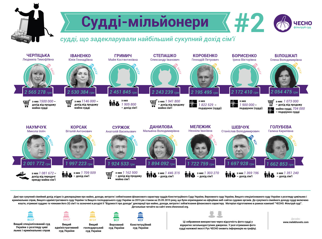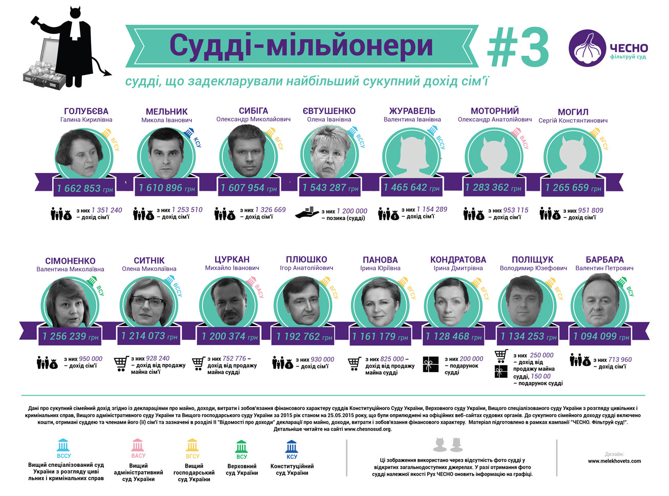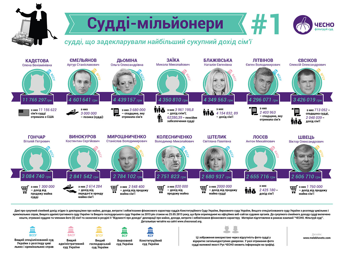 Общественное движение ЧЕСНО опубликовало первые результаты своего исследования украинских судей "Фильтруй суд: через очищение - к справедливому суду". Выяснилось, что в высших судах работают 43 судьи-миллионера. Об этом говорится на сайте движения.