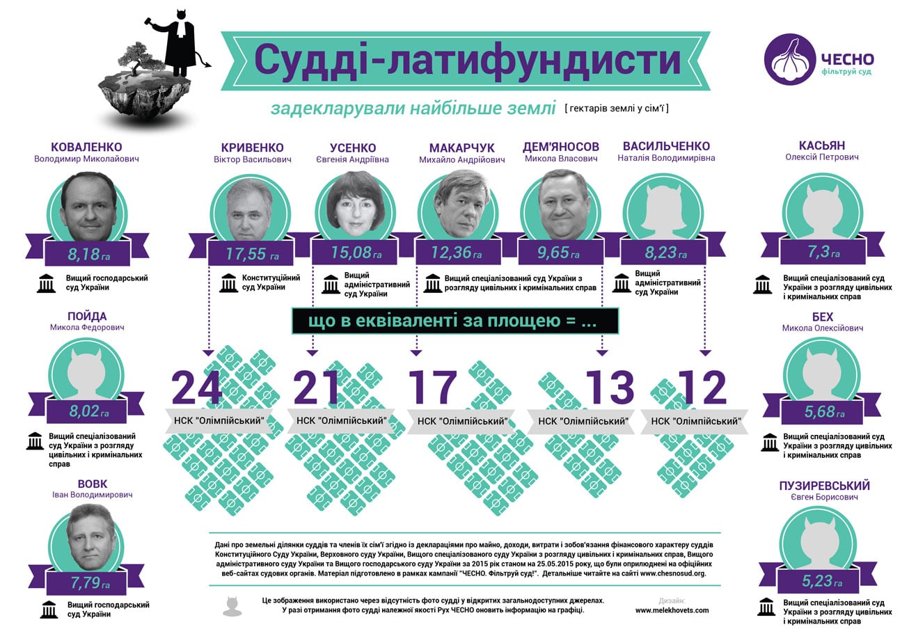 Активисты также отобрали судей, которые задекларировали больше всего земли. Из 309 судей 11 оказались крупными землевладельцами. Рейтинг возглавляет судья Конституционного суда Украины Виктор Кривенко, в собственности семьи которого 17,55 гектаров земли.
